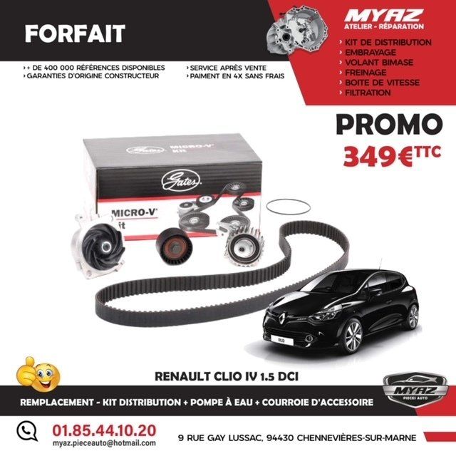 Promo en ce moment sur le remplacement du kit de distribution, de la pompe a eau et la courroie d’accessoire de marque GATES pour le Renault Clio IV 1.5 DCI.